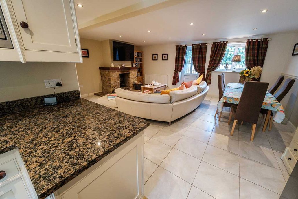 The lounge is open through to the dining and kitchen area, which has a painted Mark Wilkinson kitchen with granite work surfaces and original decorations. The kitchen floor is slate, while rugs cover the tiled floors of the living and dining areas.