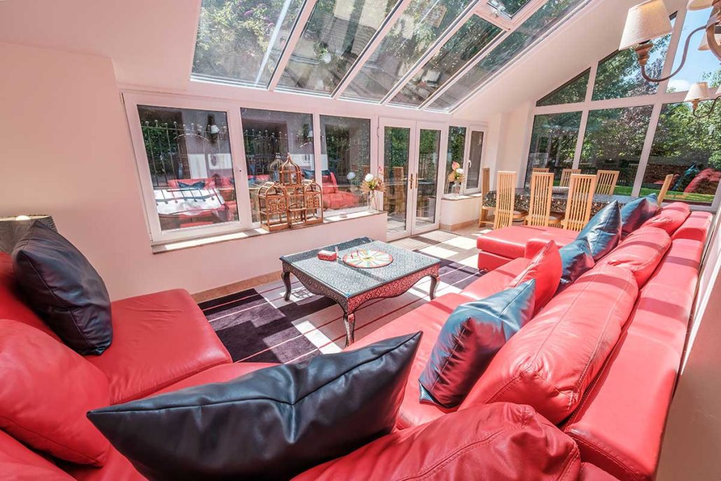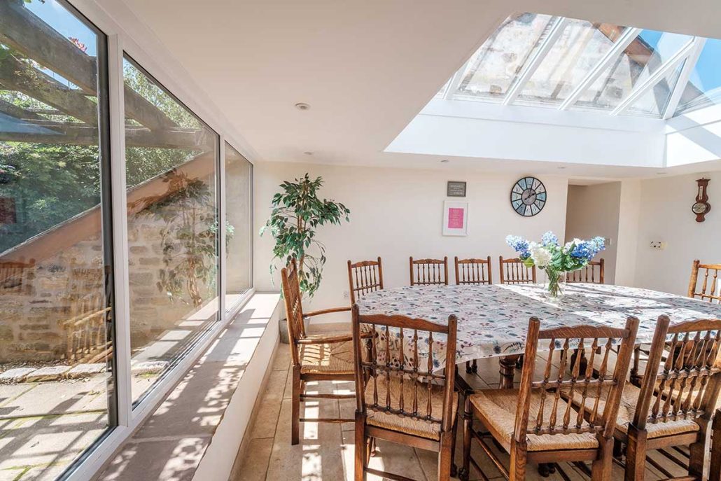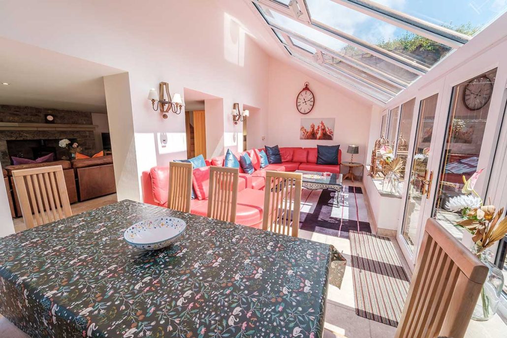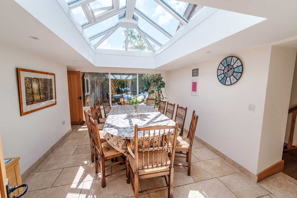 An orangery-style dining room has been added, with a feature glass ceiling and large picture windows looking out into the garden. The dining table seats eight.