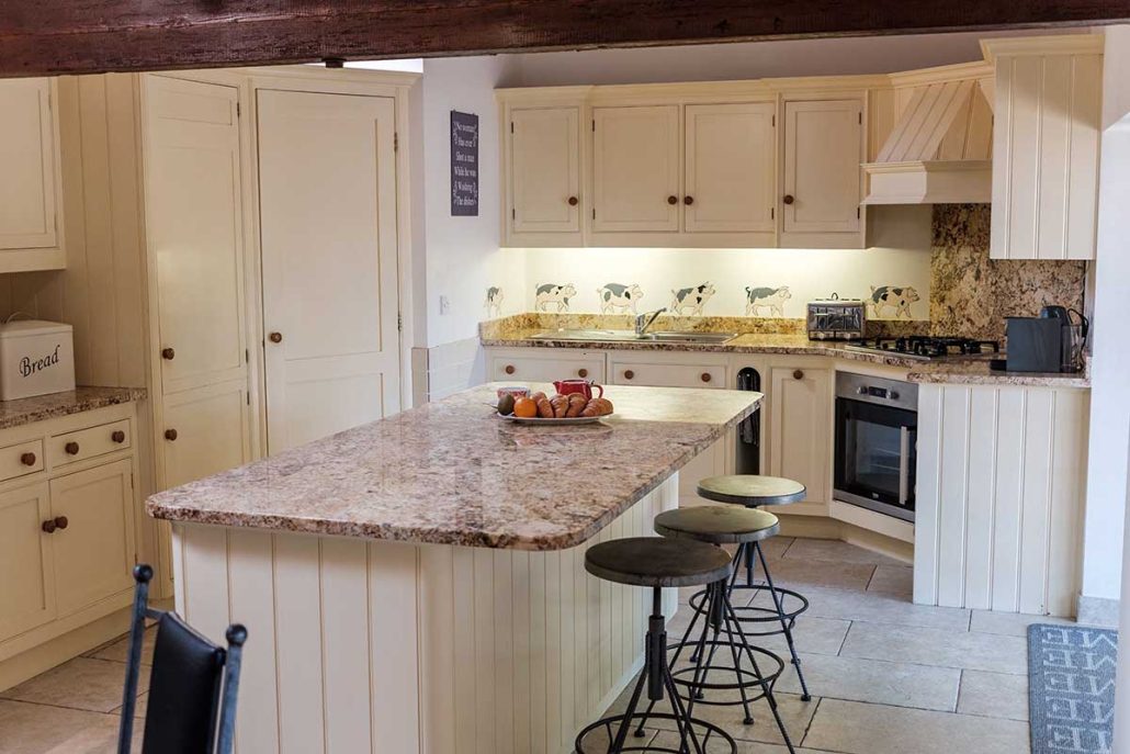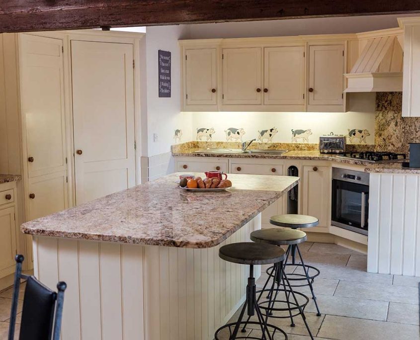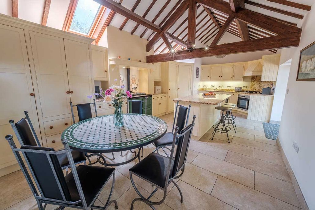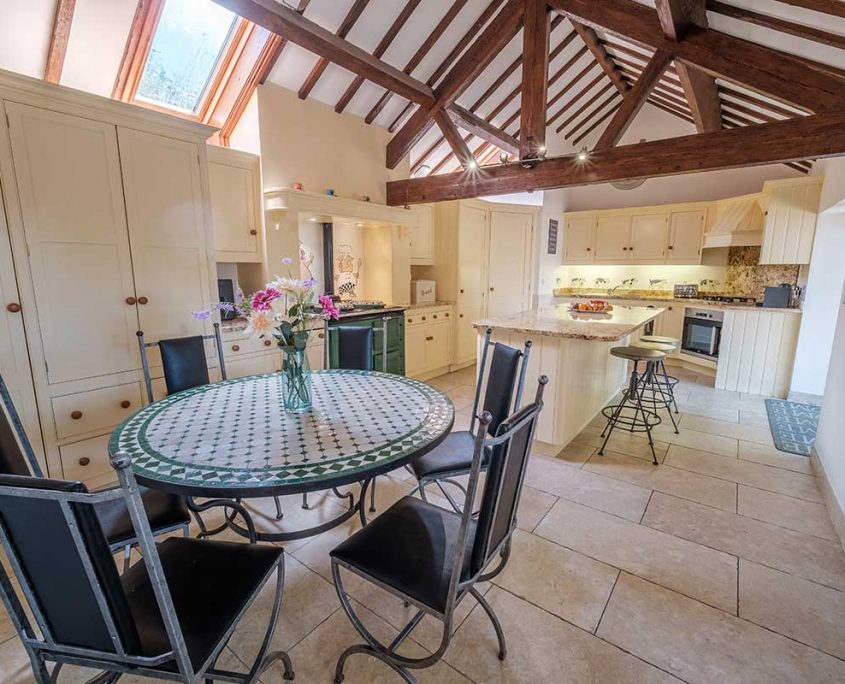 The kitchen is a delight to cook in and provides a great social area for guests. It has a huge, fully-fitted, hand-painted Mark Wilkinson kitchen, equipped with a green Aga, gas hob, oven, dishwasher, full-size fridge and freezer, granite work surfaces, island unit, seating and French doors leading into the garden.