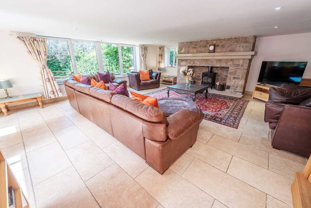 A few steps lead down into a huge new living room with a grand stone fireplace and a wood-burning stove. Large picture windows and French doors lead to the conservatory which has folding glass doors that can be opened fully to provide access to the patio and private, landscaped garden areas.